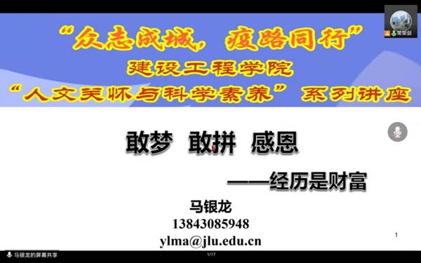 3月29日晚19:00,44118太阳成城集团勘察工程系副教授马银龙老师应学院邀请,面向学院全体本科生和研究生做了一场题为 “敢梦,敢拼,感恩”的学术报告。本次讲座为校园封闭期间,44118太阳成城集团人文关怀与科学素养系列讲座第七期,由学院学生工作办公室常荣剑老师主持。